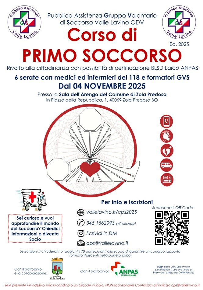 È con piacere che la Pubblica Assistenza Gruppo Volontario di Soccorso Valle Lavino propone anche quest’anno il Corso di Primo Soccorso ed. 2025 rivolto alla cittadinanza, con possibilità di ottenere la certificazione BLSD Laico ANPAS.